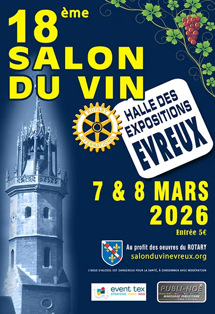 Chaque année, Le Salon Du Vin est organisé par le Club Rotary Evreux Beffroi. Il regroupe une quarantaine de viticulteurs de toutes les régions de France à la Halle des Expositions à Evreux pour vous faire découvrir et déguster plus de 350 vins différents.